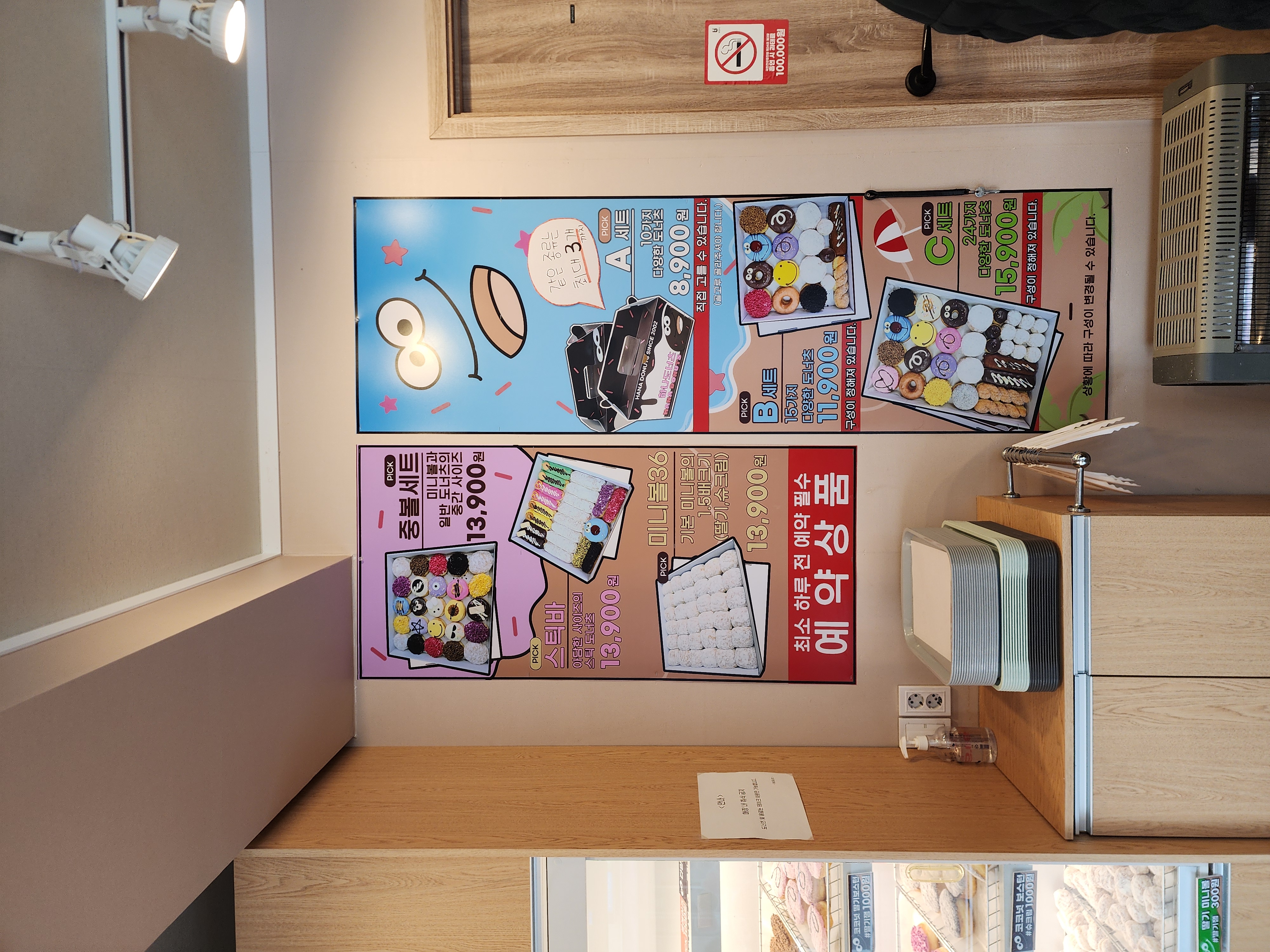 안 쪽에는 도넛세트 샘플이 있고 그 옆으론 포장된 도넛이 박스에 담겨 쌓아져 있었어요.