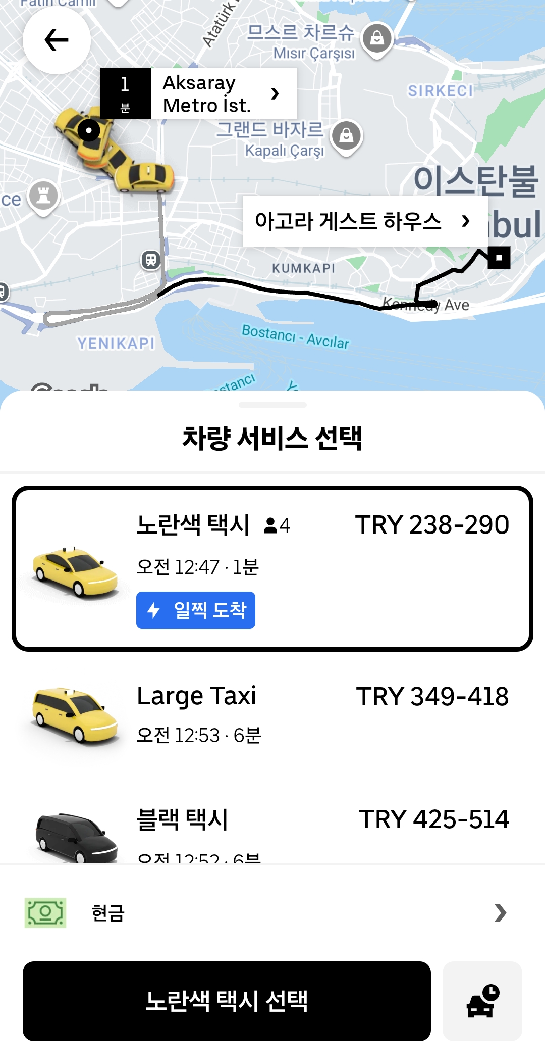 여기에 악사라이에서 내려서 어떻게 할지 생각을 해보면서 우버 조회를 해봤습니다