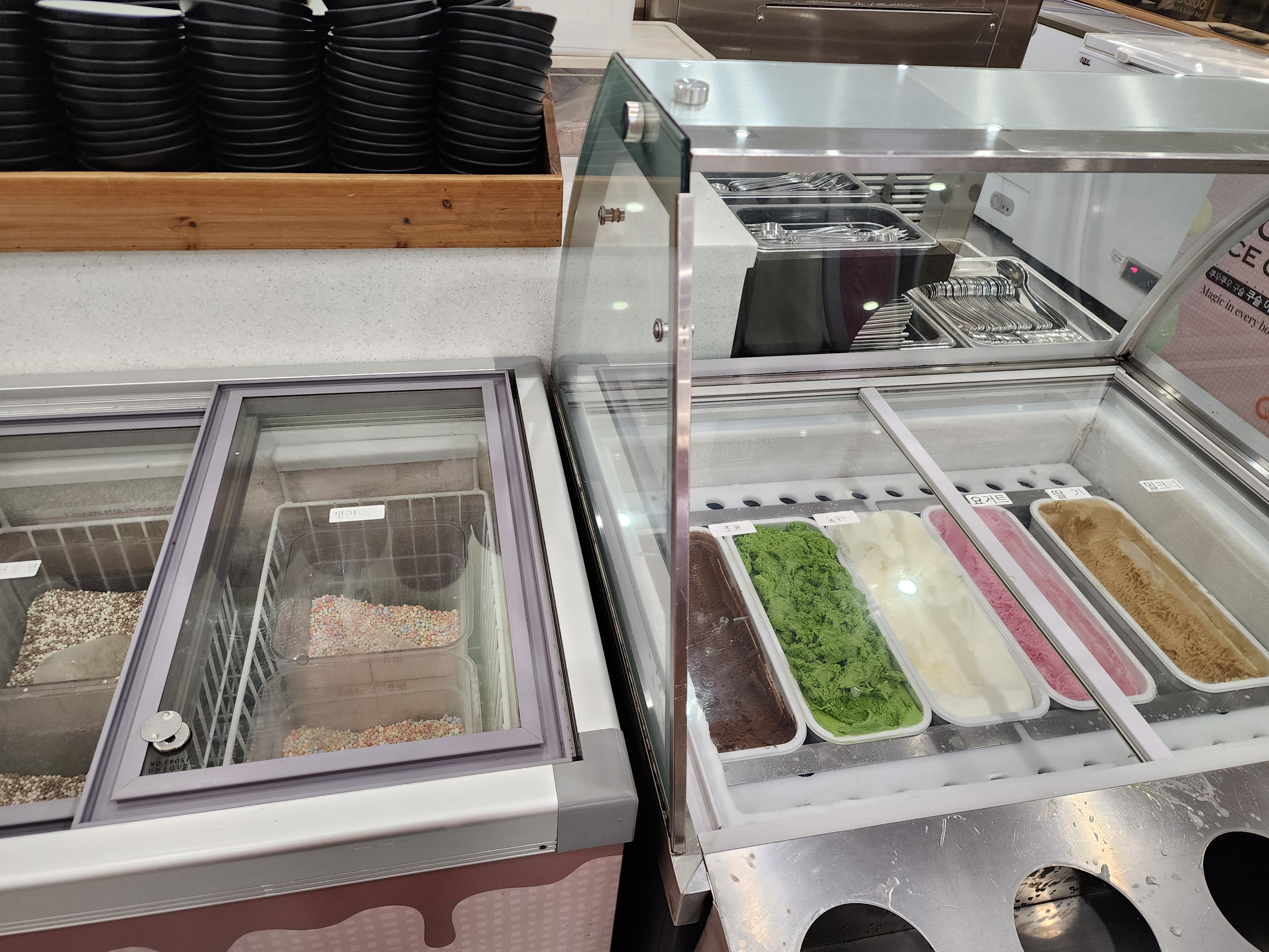 구슬아이스크림 위에 레인보우맛이 더 취항이었고 초코밀크맛은 살짝 그 토네이도 아이스크림 아시나요 그거 초코밀크 같이 먹는 맛이랑 비슷했어요 ㅋㅋ