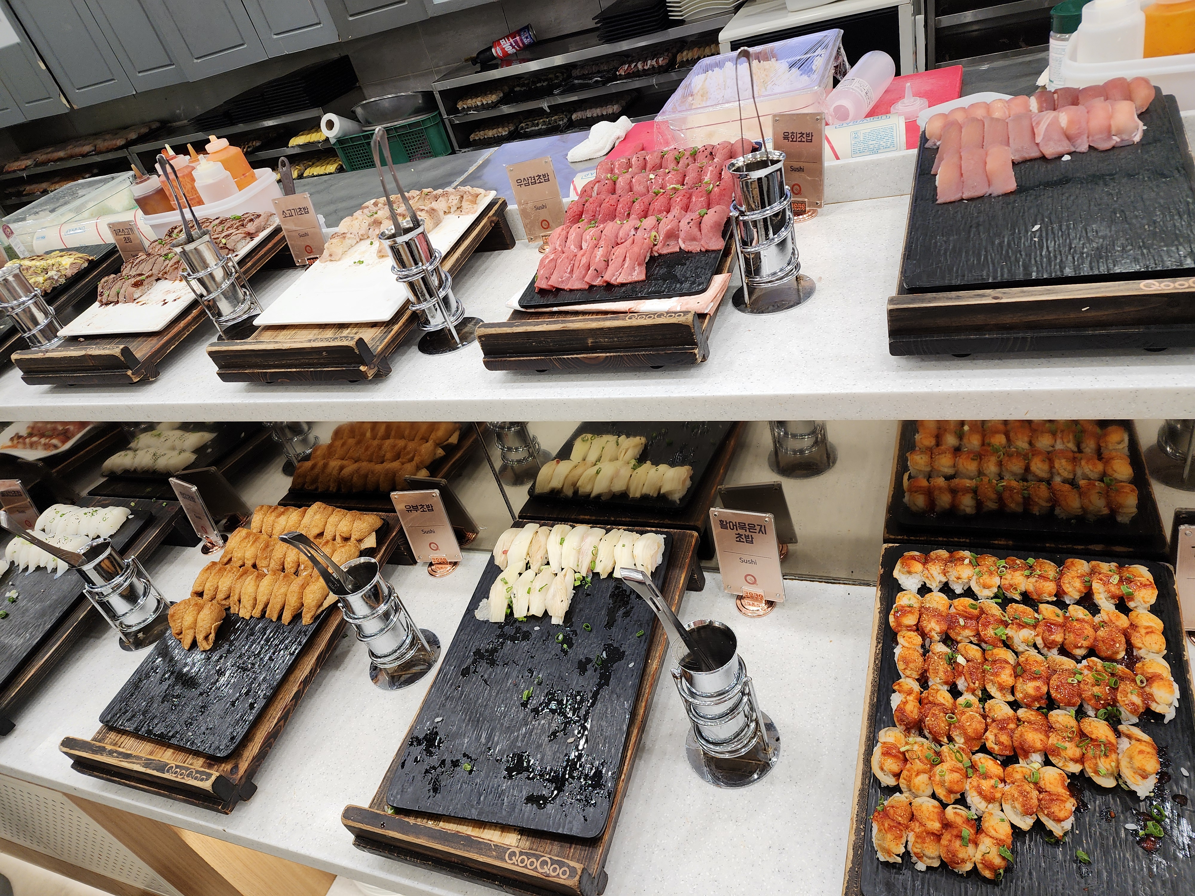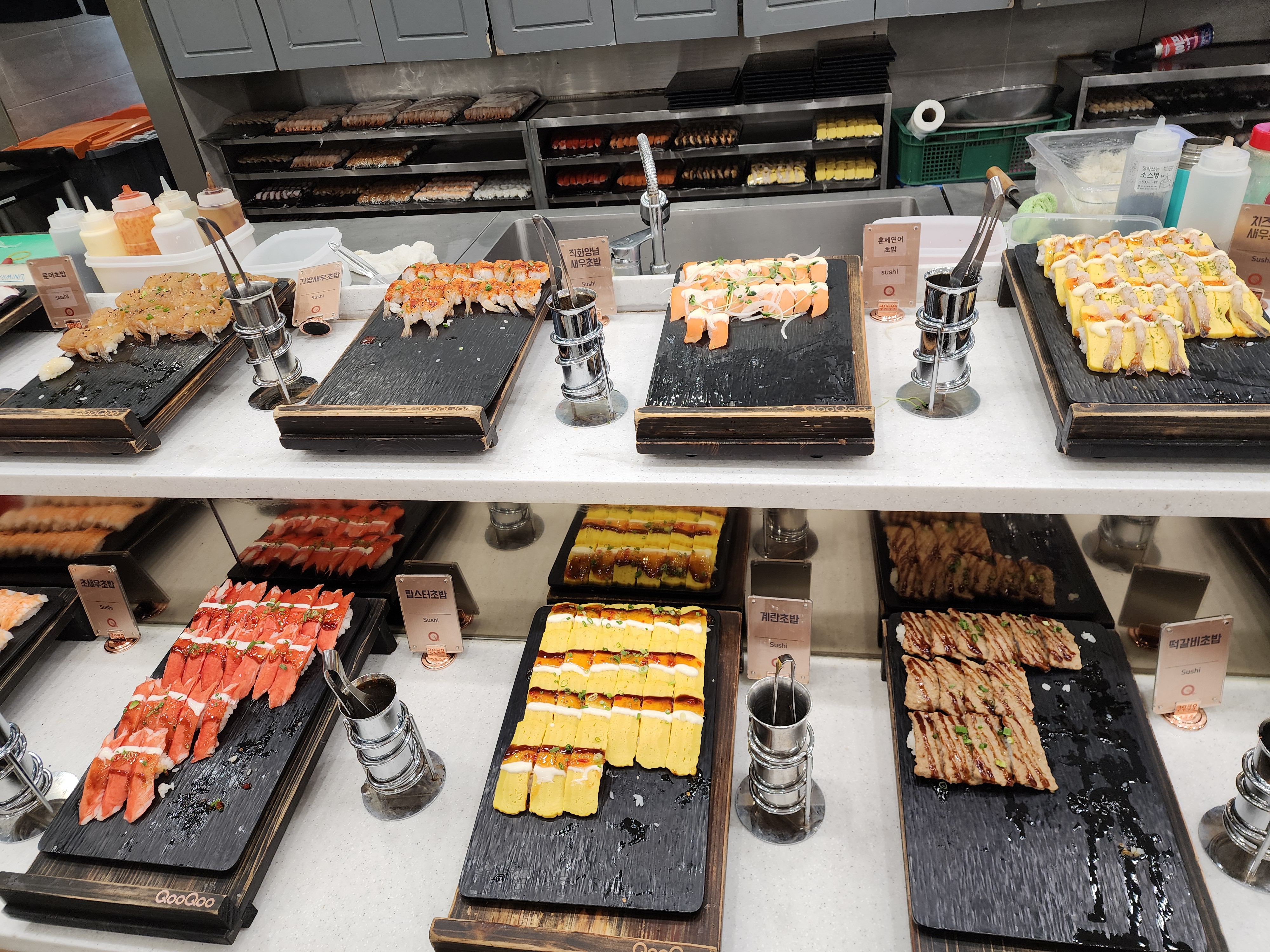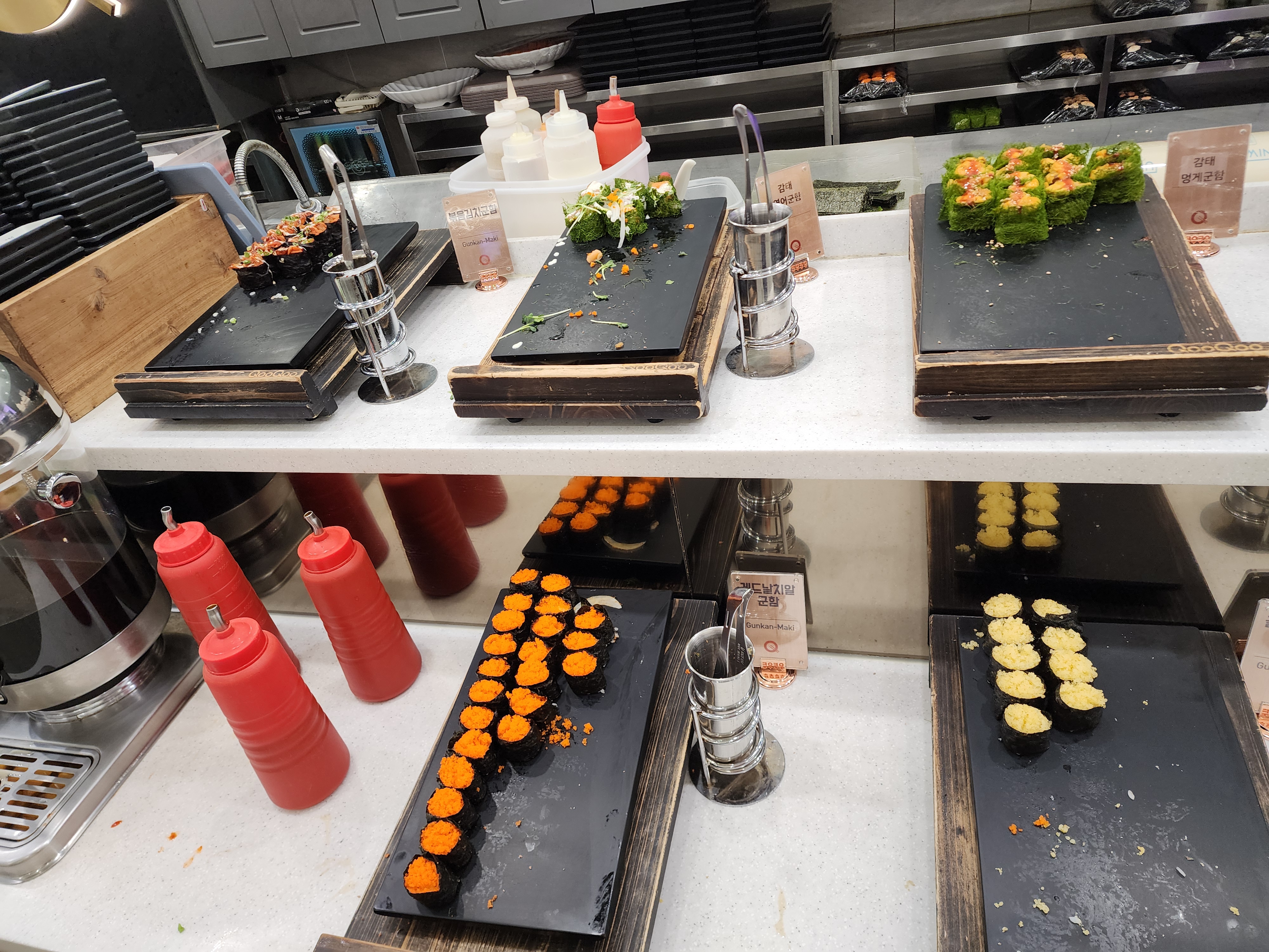 롤, 군함 종류 겁나 많아,,, 바로 옆에 간장 등 담을 수 있는 코너가 있어요