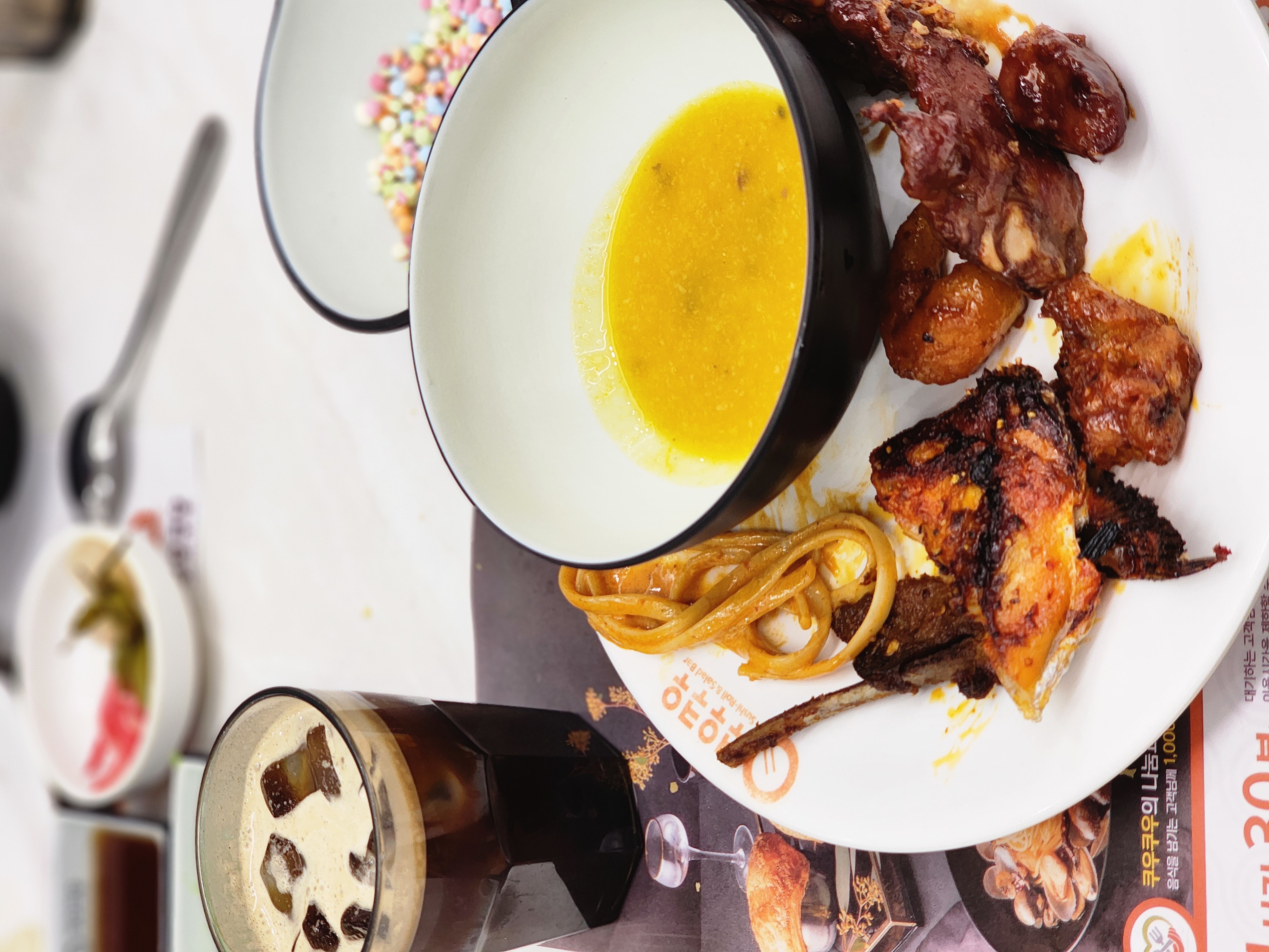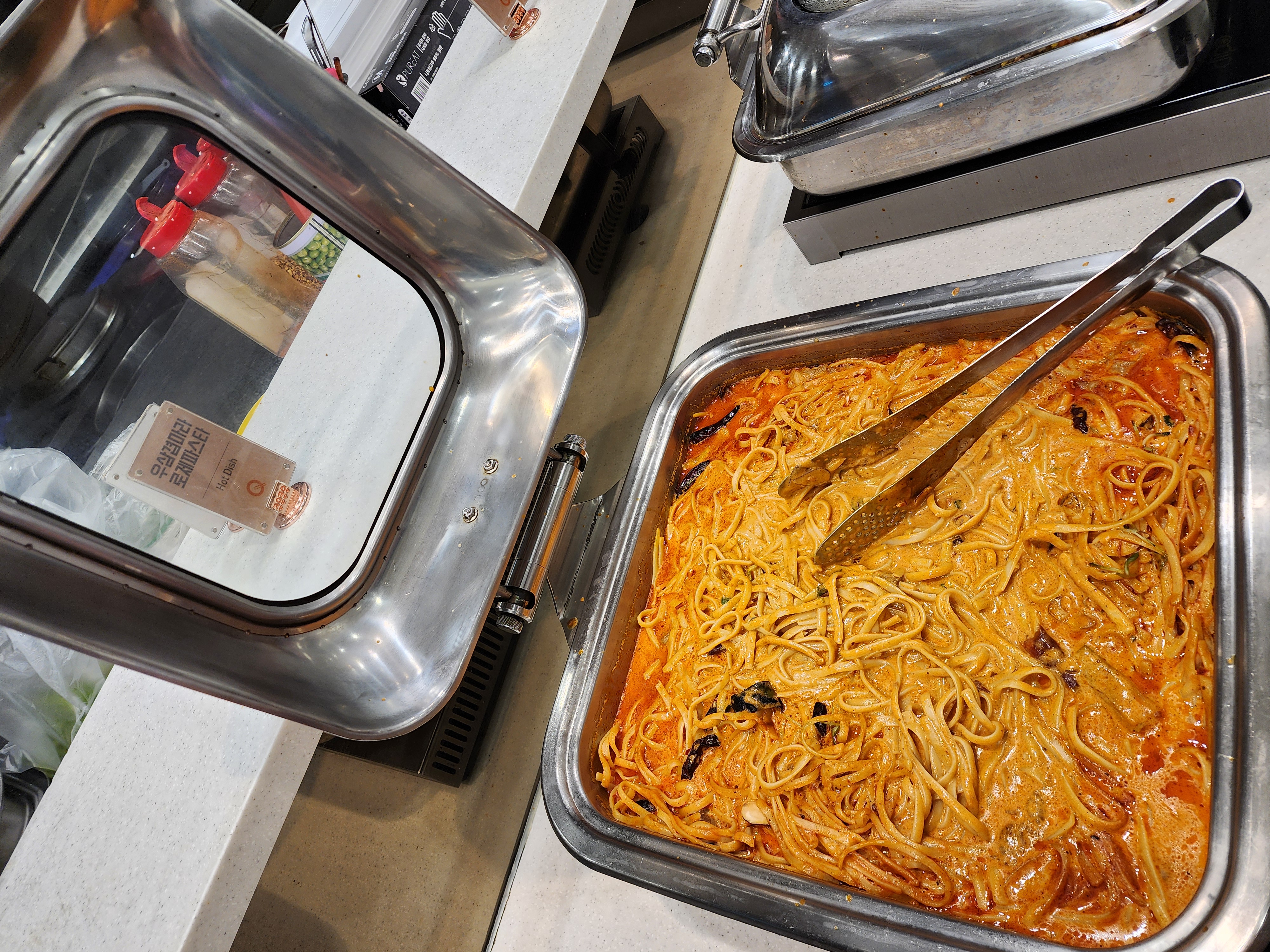 위에 파스타 같은 거 우삼겹마라로제파스타인데 맛있어요. 면이 링귀니면이라 덜 불고 좀 더 쫀득한 느낌이에요 마라 좋아하시면 추천