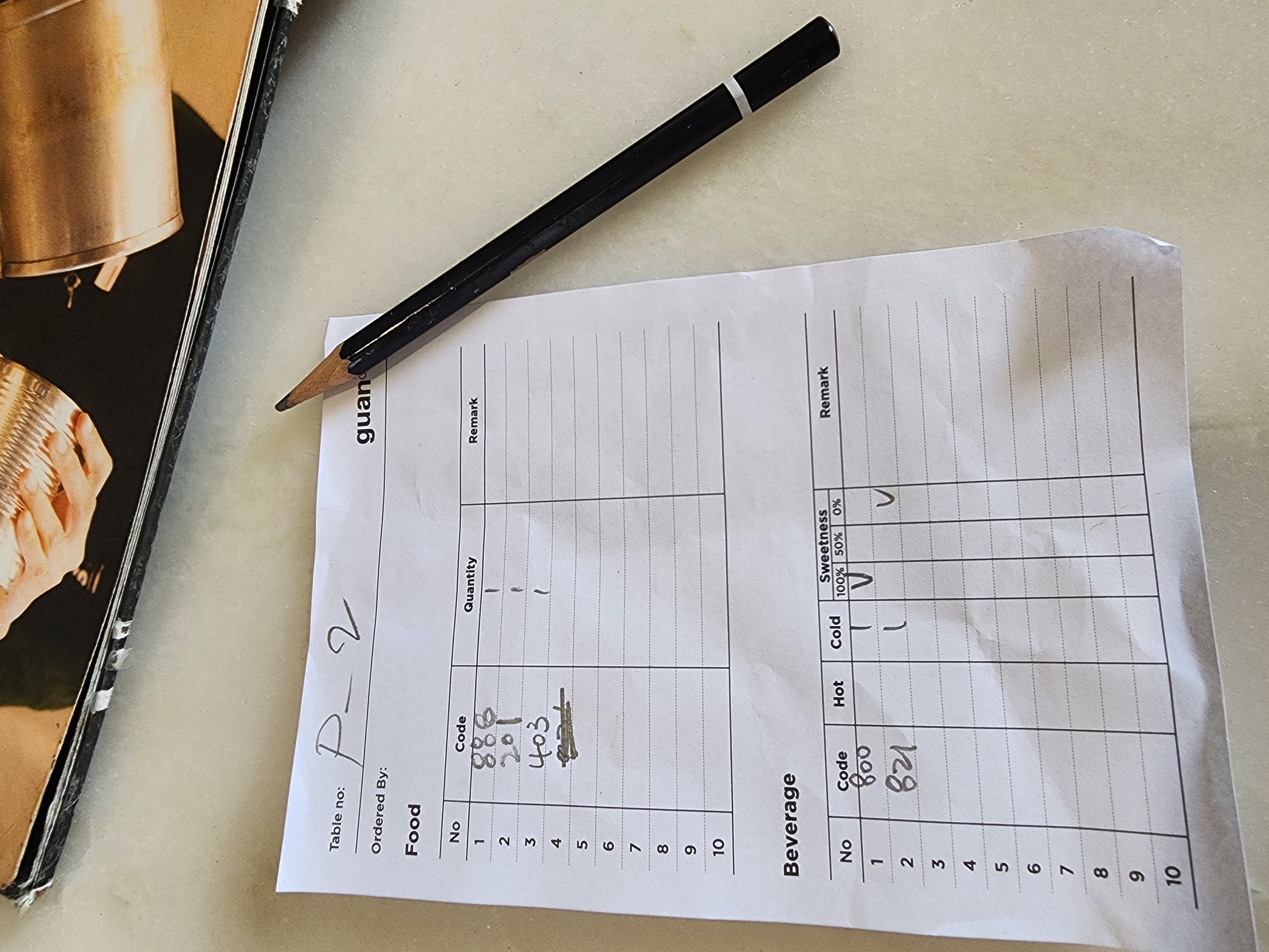 위쪽에는 주문할 음식 번호를 적고 아래는 음료를 적으면 됩니다.