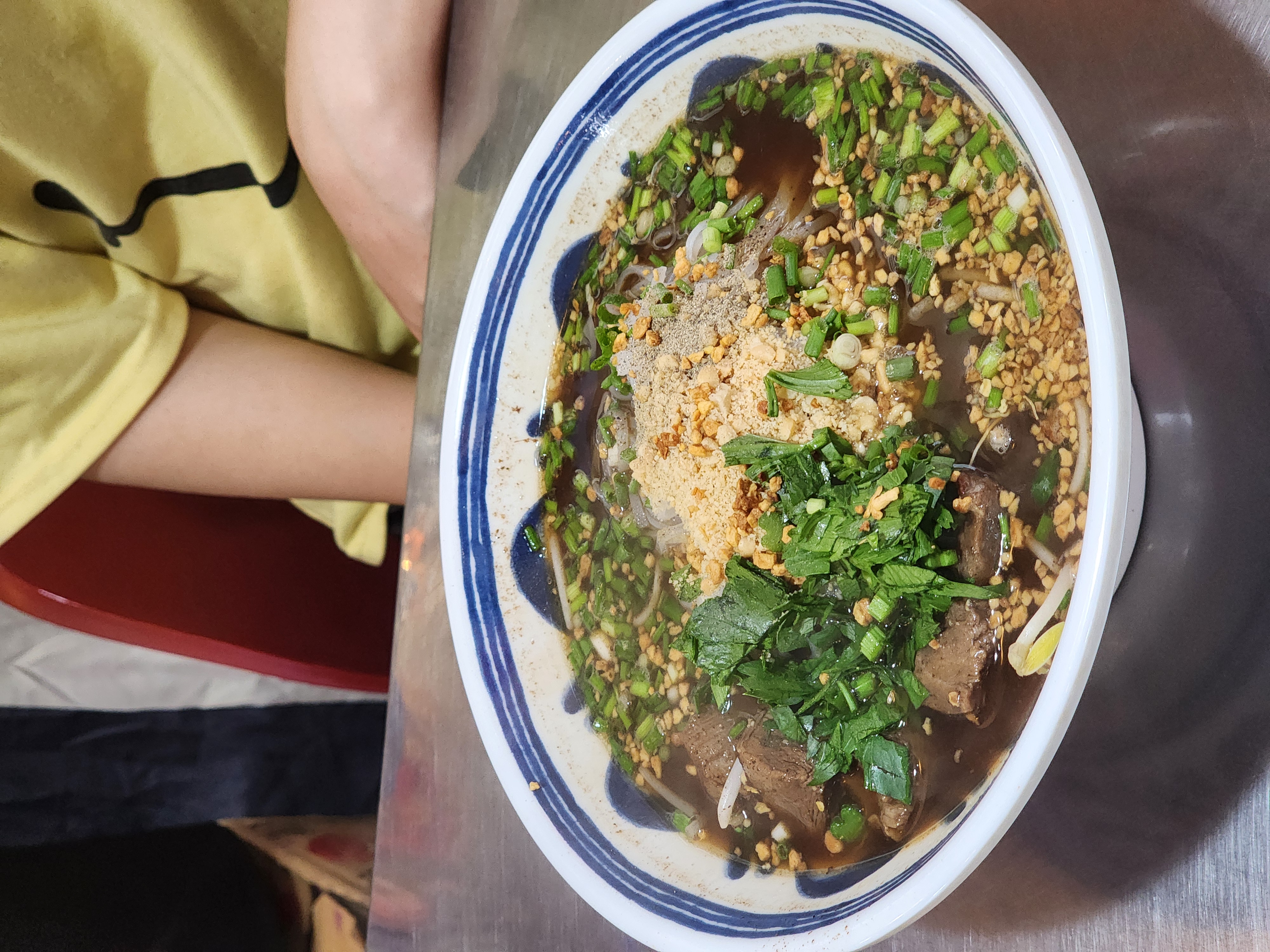 베트남쌀국수랑 다르게 갈색이에요 위에 올라간 게 고수인가 했는데 샐러리잎이래요